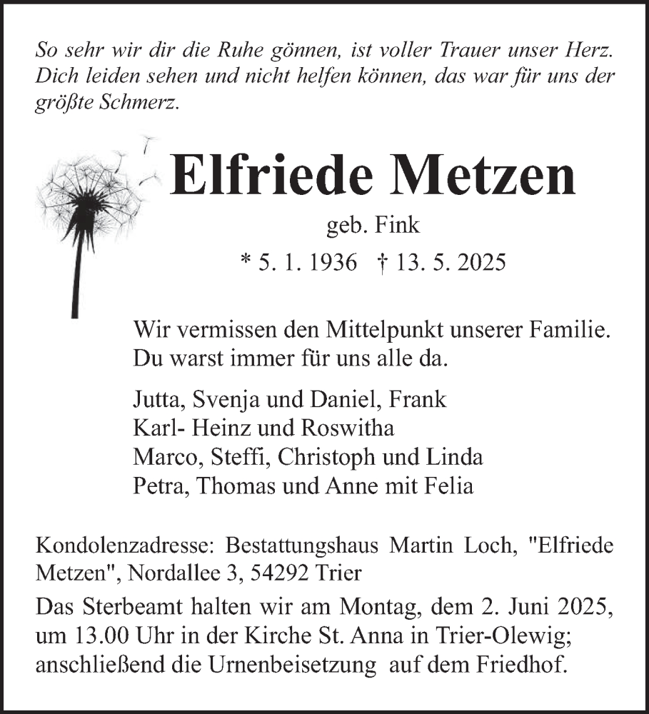 Hier finden Sie alle Traueranzeigen aus der Zeitung, die bisher für Elfriede Metzen erschienen sind. Weitere Traueranzeigen, die in der Zeitung erscheinen, werden hier ebenfalls aufgelistet