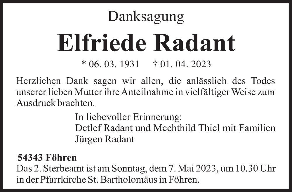 Hier finden Sie alle Traueranzeigen aus der Zeitung, die bisher für Elfriede Radant erschienen sind. Weitere Traueranzeigen, die in der Zeitung erscheinen, werden hier ebenfalls aufgelistet