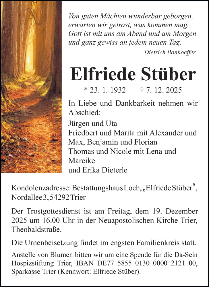 Hier finden Sie alle Traueranzeigen aus der Zeitung, die bisher für Elfriede Stüber erschienen sind. Weitere Traueranzeigen, die in der Zeitung erscheinen, werden hier ebenfalls aufgelistet