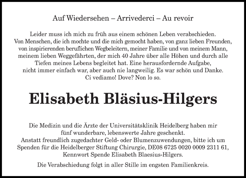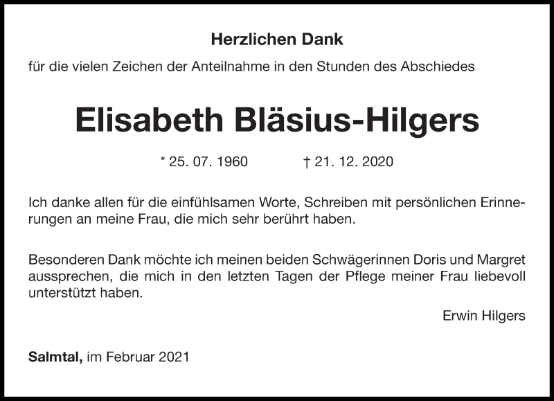Hier finden Sie alle Traueranzeigen aus der Zeitung, die bisher für Elisabeth Bläsius-Hilgers erschienen sind. Weitere Traueranzeigen, die in der Zeitung erscheinen, werden hier ebenfalls aufgelistet