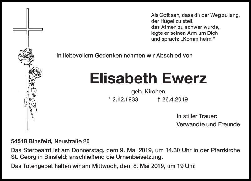 Hier finden Sie alle Traueranzeigen aus der Zeitung, die bisher für Elisabeth Ewerz erschienen sind. Weitere Traueranzeigen, die in der Zeitung erscheinen, werden hier ebenfalls aufgelistet