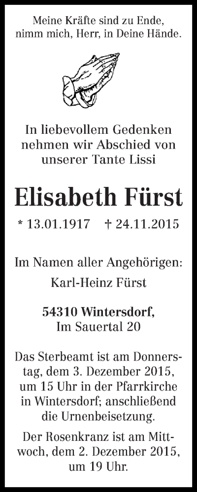 Hier finden Sie alle Traueranzeigen aus der Zeitung, die bisher für Elisabeth Fürst erschienen sind. Weitere Traueranzeigen, die in der Zeitung erscheinen, werden hier ebenfalls aufgelistet