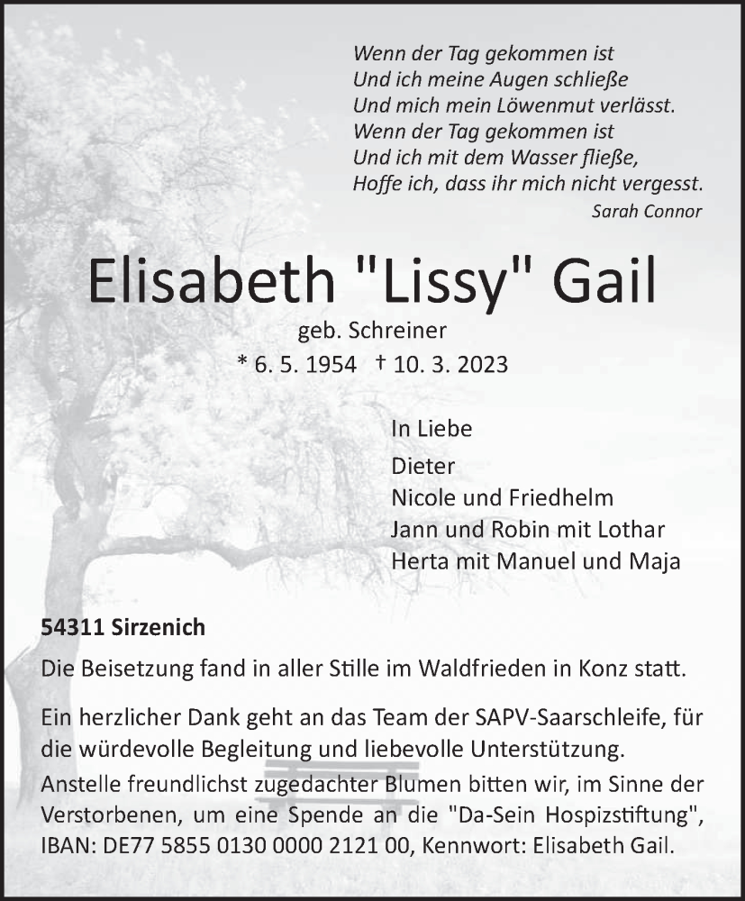Hier finden Sie alle Traueranzeigen aus der Zeitung, die bisher für Elisabeth Gail erschienen sind. Weitere Traueranzeigen, die in der Zeitung erscheinen, werden hier ebenfalls aufgelistet