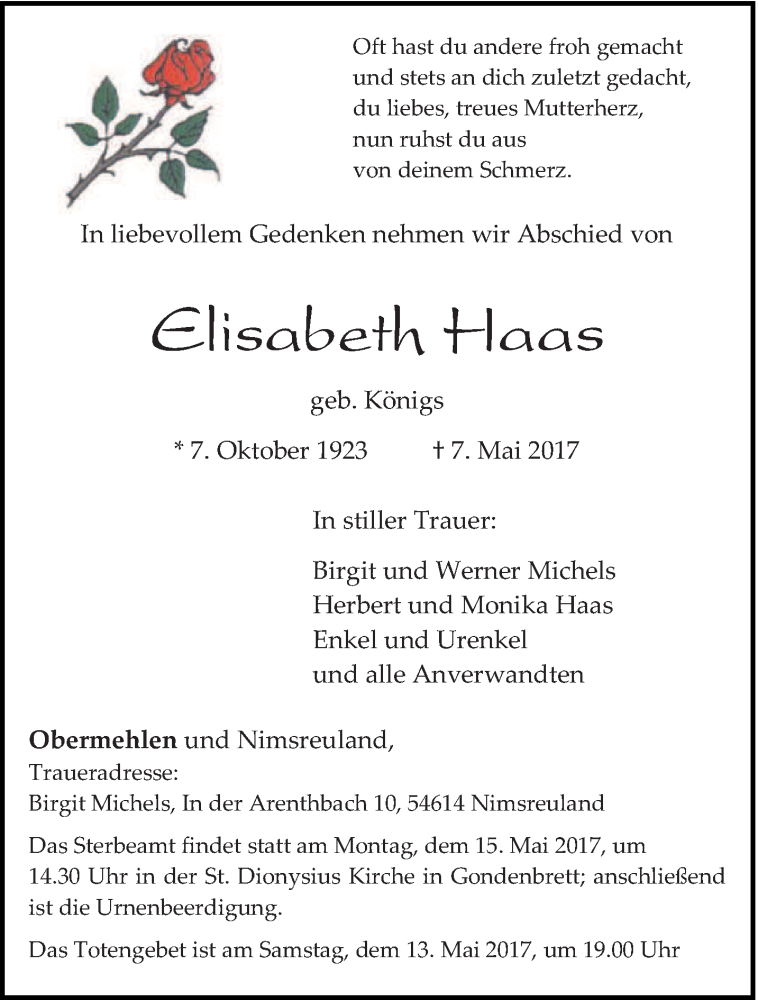 Hier finden Sie alle Traueranzeigen aus der Zeitung, die bisher für Elisabeth Haas erschienen sind. Weitere Traueranzeigen, die in der Zeitung erscheinen, werden hier ebenfalls aufgelistet