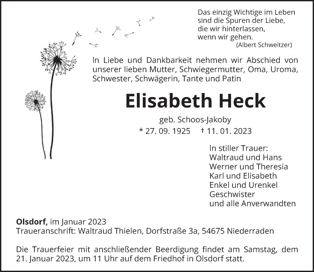 Hier finden Sie alle Traueranzeigen aus der Zeitung, die bisher für Elisabeth Heck erschienen sind. Weitere Traueranzeigen, die in der Zeitung erscheinen, werden hier ebenfalls aufgelistet