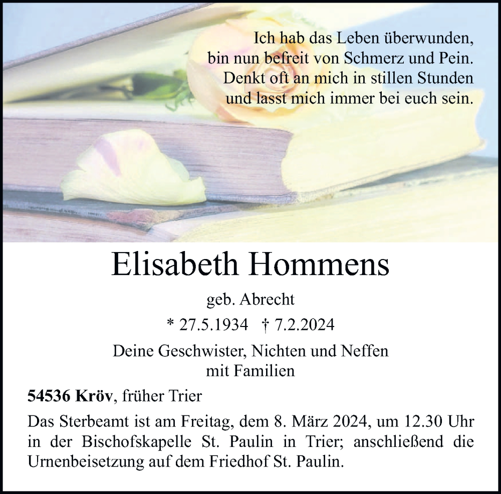 Hier finden Sie alle Traueranzeigen aus der Zeitung, die bisher für Elisabeth Hommens erschienen sind. Weitere Traueranzeigen, die in der Zeitung erscheinen, werden hier ebenfalls aufgelistet