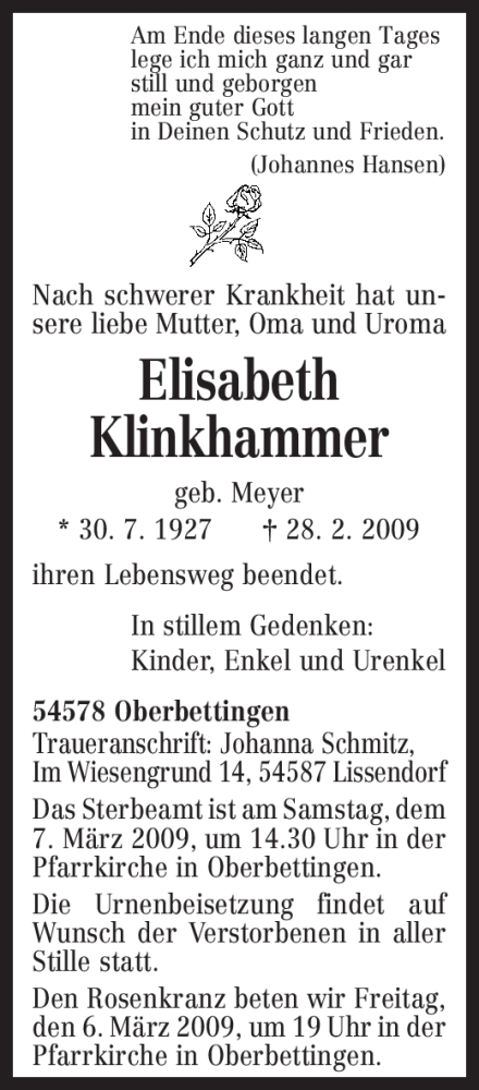 Hier finden Sie alle Traueranzeigen aus der Zeitung, die bisher für Elisabeth Klinkhammer erschienen sind. Weitere Traueranzeigen, die in der Zeitung erscheinen, werden hier ebenfalls aufgelistet