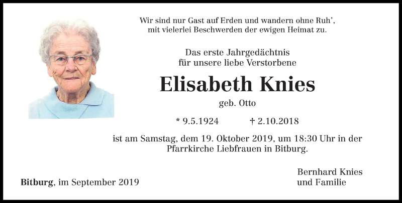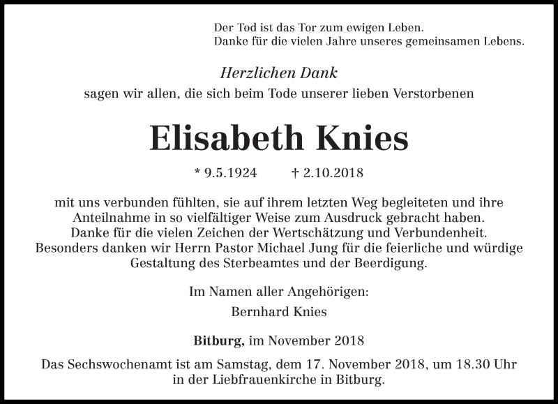 Hier finden Sie alle Traueranzeigen aus der Zeitung, die bisher für Elisabeth Knies erschienen sind. Weitere Traueranzeigen, die in der Zeitung erscheinen, werden hier ebenfalls aufgelistet