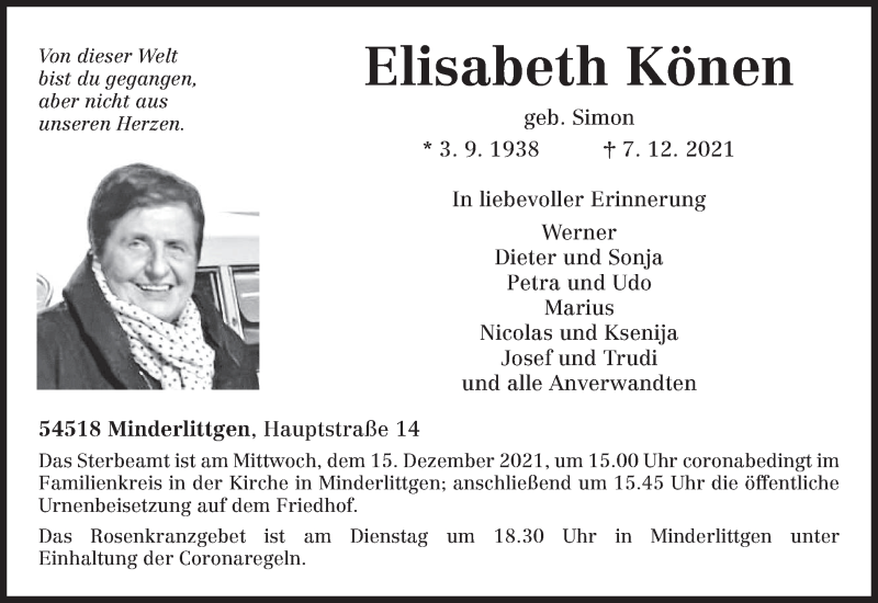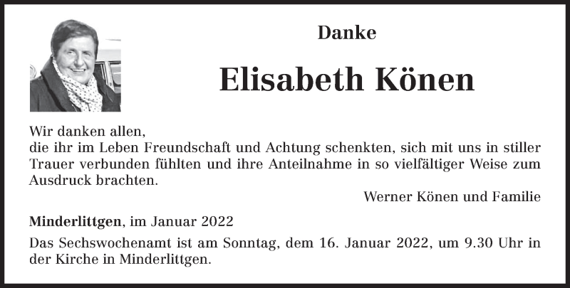 Hier finden Sie alle Traueranzeigen aus der Zeitung, die bisher für Elisabeth Könen erschienen sind. Weitere Traueranzeigen, die in der Zeitung erscheinen, werden hier ebenfalls aufgelistet