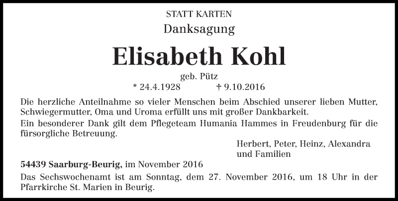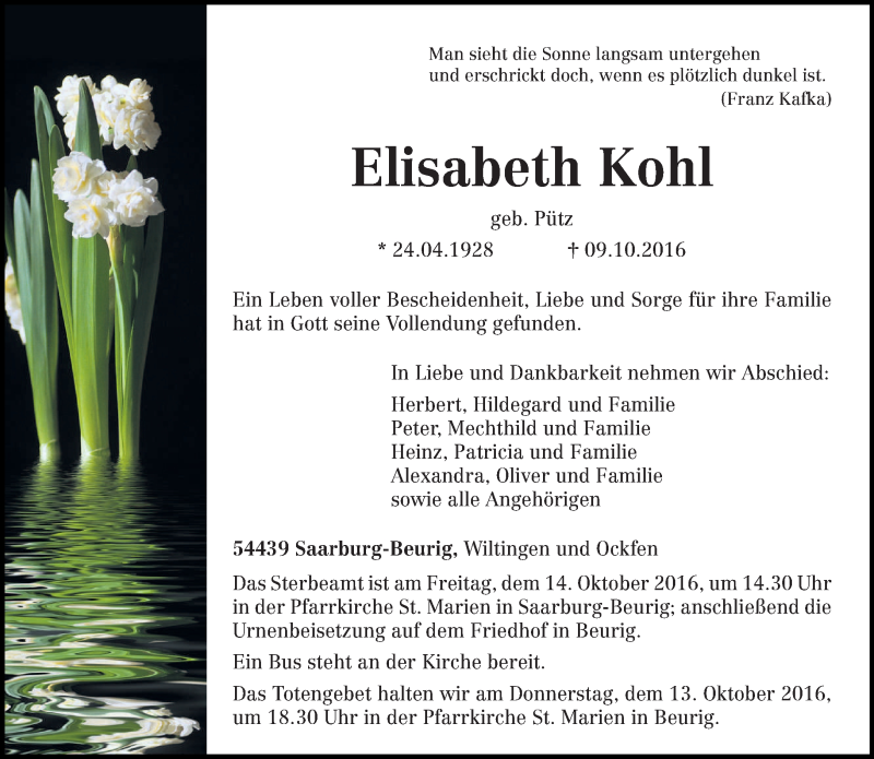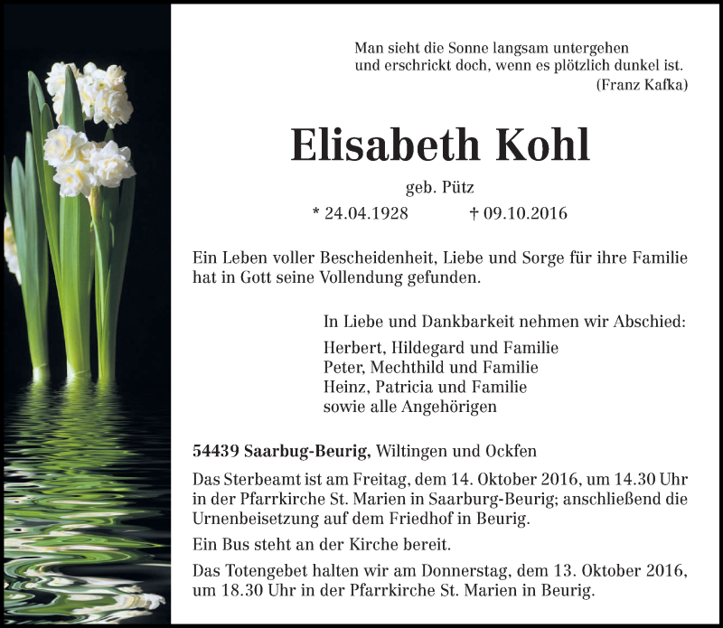 Hier finden Sie alle Traueranzeigen aus der Zeitung, die bisher für Elisabeth Kohl erschienen sind. Weitere Traueranzeigen, die in der Zeitung erscheinen, werden hier ebenfalls aufgelistet