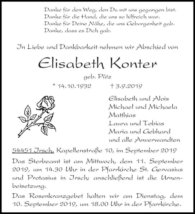 Hier finden Sie alle Traueranzeigen aus der Zeitung, die bisher für Elisabeth Konter erschienen sind. Weitere Traueranzeigen, die in der Zeitung erscheinen, werden hier ebenfalls aufgelistet