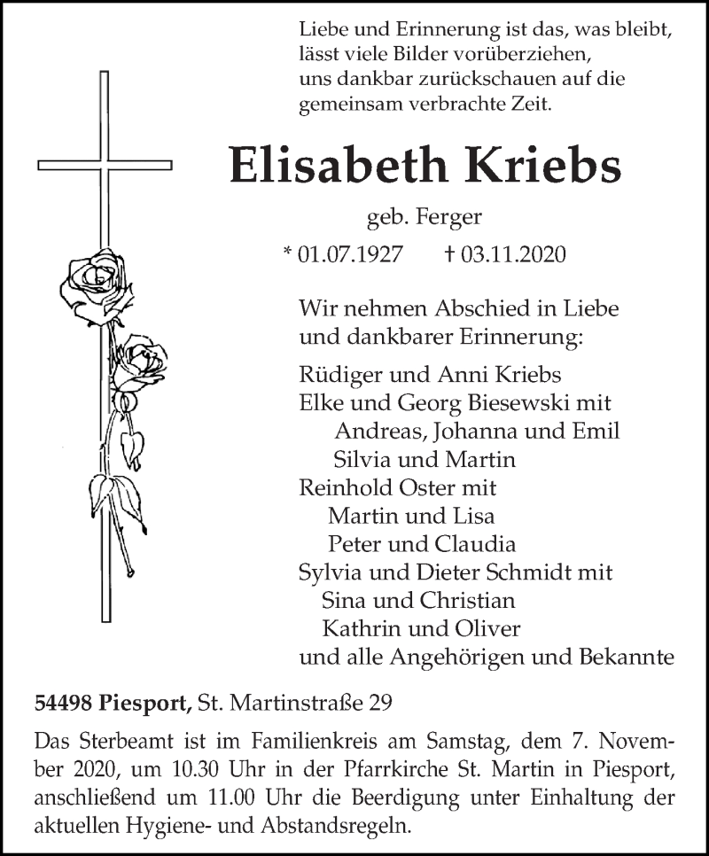 Hier finden Sie alle Traueranzeigen aus der Zeitung, die bisher für Elisabeth Kriebs erschienen sind. Weitere Traueranzeigen, die in der Zeitung erscheinen, werden hier ebenfalls aufgelistet
