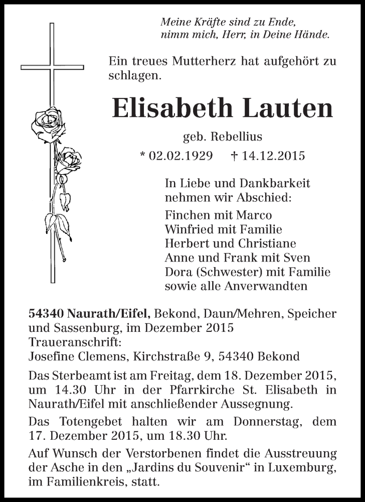 Hier finden Sie alle Traueranzeigen aus der Zeitung, die bisher für Elisabeth Lauten erschienen sind. Weitere Traueranzeigen, die in der Zeitung erscheinen, werden hier ebenfalls aufgelistet
