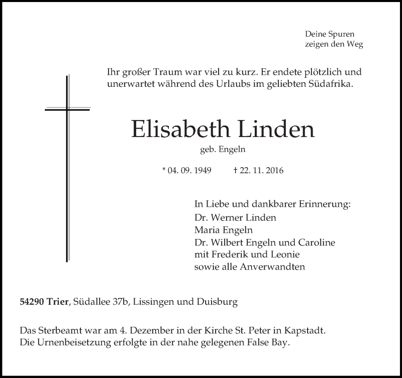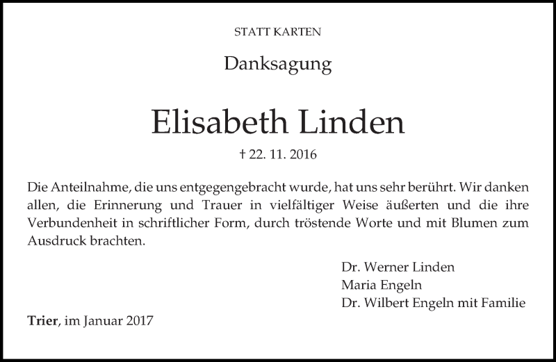 Hier finden Sie alle Traueranzeigen aus der Zeitung, die bisher für Elisabeth Linden erschienen sind. Weitere Traueranzeigen, die in der Zeitung erscheinen, werden hier ebenfalls aufgelistet