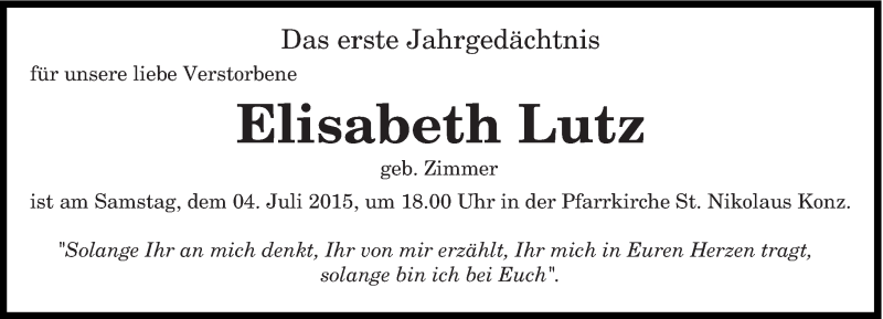 Hier finden Sie alle Traueranzeigen aus der Zeitung, die bisher für Elisabeth Lutz erschienen sind. Weitere Traueranzeigen, die in der Zeitung erscheinen, werden hier ebenfalls aufgelistet