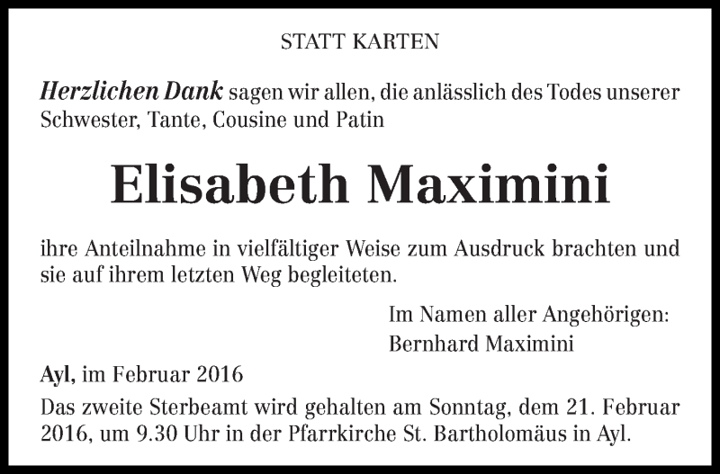 Hier finden Sie alle Traueranzeigen aus der Zeitung, die bisher für Elisabeth Maximini erschienen sind. Weitere Traueranzeigen, die in der Zeitung erscheinen, werden hier ebenfalls aufgelistet