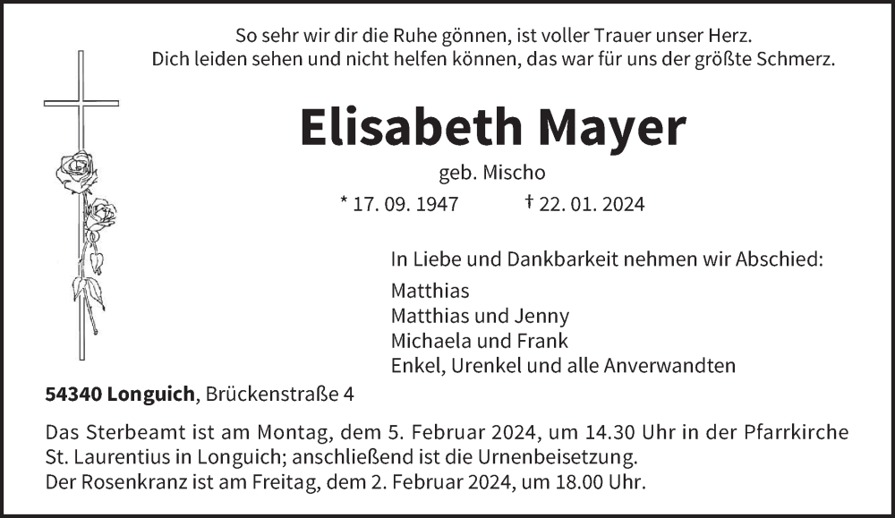 Hier finden Sie alle Traueranzeigen aus der Zeitung, die bisher für Elisabeth Mayer erschienen sind. Weitere Traueranzeigen, die in der Zeitung erscheinen, werden hier ebenfalls aufgelistet