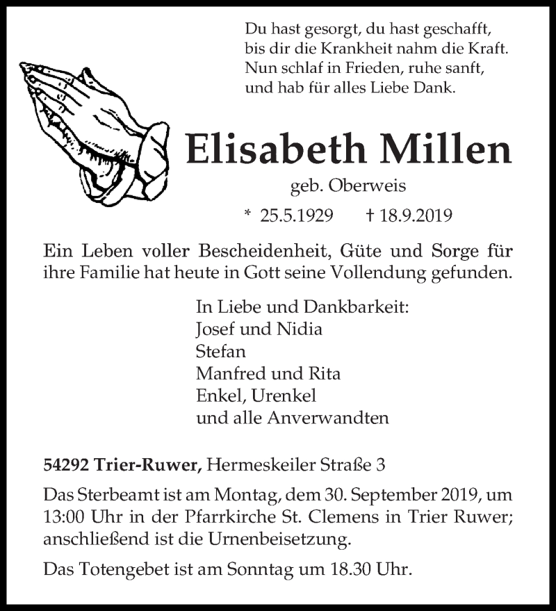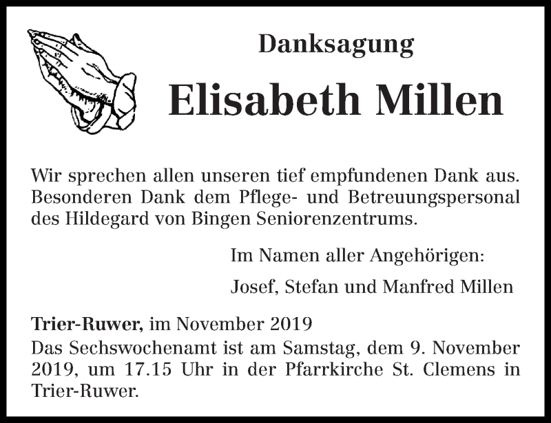 Hier finden Sie alle Traueranzeigen aus der Zeitung, die bisher für Elisabeth Millen erschienen sind. Weitere Traueranzeigen, die in der Zeitung erscheinen, werden hier ebenfalls aufgelistet