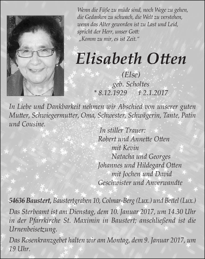 Hier finden Sie alle Traueranzeigen aus der Zeitung, die bisher für Elisabeth Otten erschienen sind. Weitere Traueranzeigen, die in der Zeitung erscheinen, werden hier ebenfalls aufgelistet