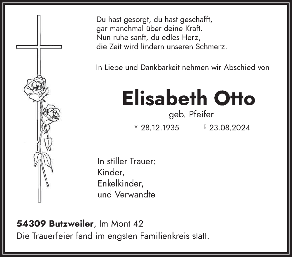 Hier finden Sie alle Traueranzeigen aus der Zeitung, die bisher für Elisabeth Otto erschienen sind. Weitere Traueranzeigen, die in der Zeitung erscheinen, werden hier ebenfalls aufgelistet