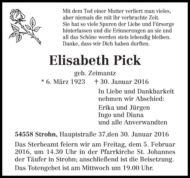 Hier finden Sie alle Traueranzeigen aus der Zeitung, die bisher für Elisabeth Pick erschienen sind. Weitere Traueranzeigen, die in der Zeitung erscheinen, werden hier ebenfalls aufgelistet