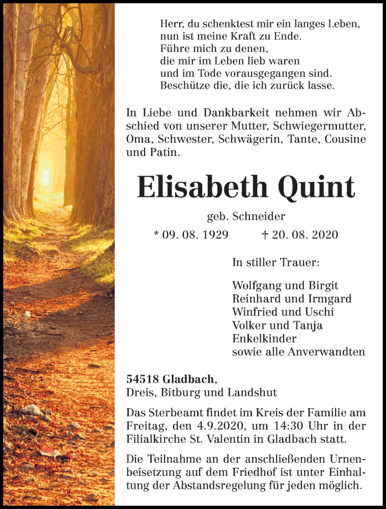 Hier finden Sie alle Traueranzeigen aus der Zeitung, die bisher für Elisabeth Quint erschienen sind. Weitere Traueranzeigen, die in der Zeitung erscheinen, werden hier ebenfalls aufgelistet