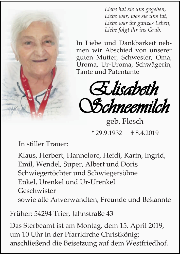 Hier finden Sie alle Traueranzeigen aus der Zeitung, die bisher für Elisabeth Schneemilch erschienen sind. Weitere Traueranzeigen, die in der Zeitung erscheinen, werden hier ebenfalls aufgelistet