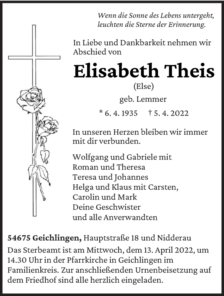 Hier finden Sie alle Traueranzeigen aus der Zeitung, die bisher für Elisabeth Theis erschienen sind. Weitere Traueranzeigen, die in der Zeitung erscheinen, werden hier ebenfalls aufgelistet
