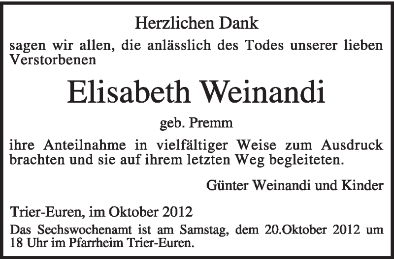 Hier finden Sie alle Traueranzeigen aus der Zeitung, die bisher für Elisabeth Weinandi erschienen sind. Weitere Traueranzeigen, die in der Zeitung erscheinen, werden hier ebenfalls aufgelistet