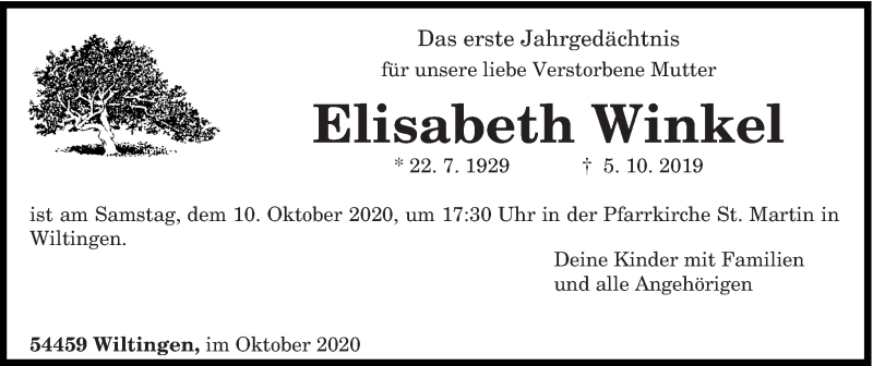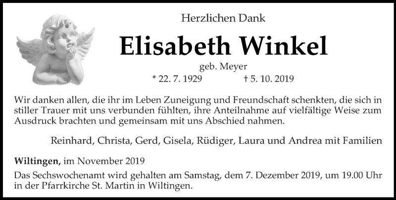 Hier finden Sie alle Traueranzeigen aus der Zeitung, die bisher für Elisabeth Winkel erschienen sind. Weitere Traueranzeigen, die in der Zeitung erscheinen, werden hier ebenfalls aufgelistet
