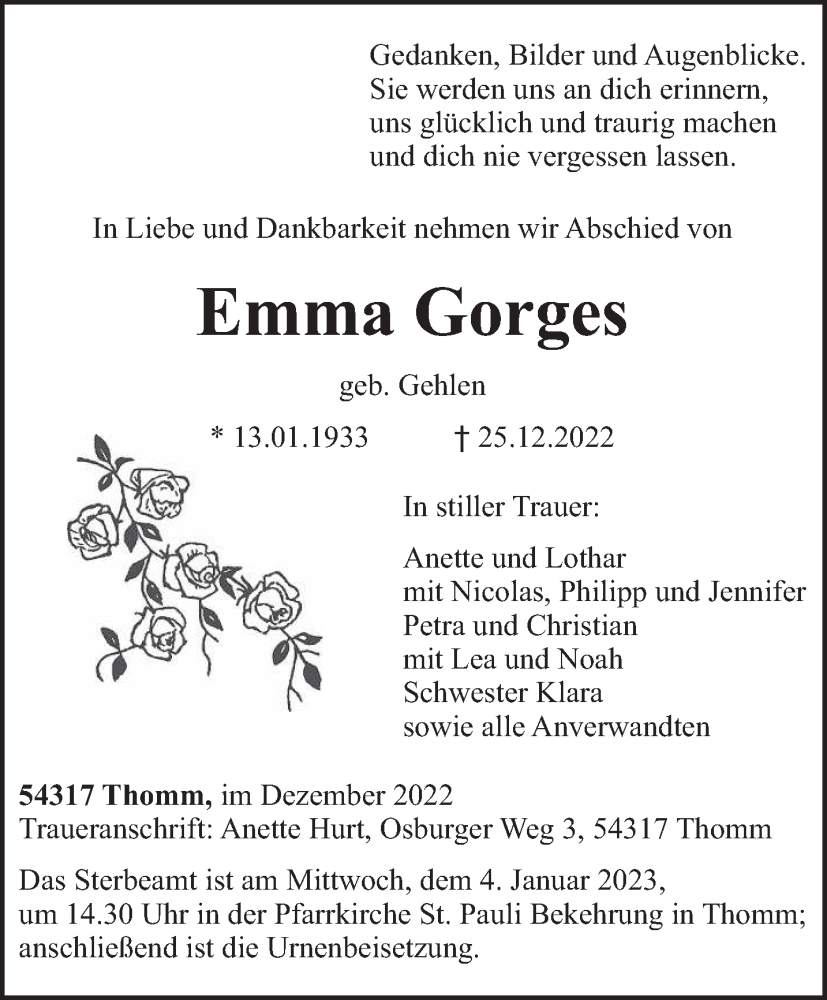 Hier finden Sie alle Traueranzeigen aus der Zeitung, die bisher für Emma Gorges erschienen sind. Weitere Traueranzeigen, die in der Zeitung erscheinen, werden hier ebenfalls aufgelistet