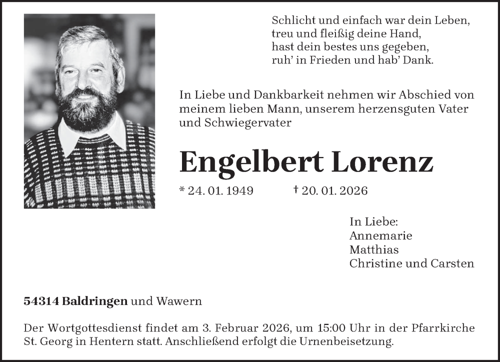 Hier finden Sie alle Traueranzeigen aus der Zeitung, die bisher für Engelbert Lorenz erschienen sind. Weitere Traueranzeigen, die in der Zeitung erscheinen, werden hier ebenfalls aufgelistet