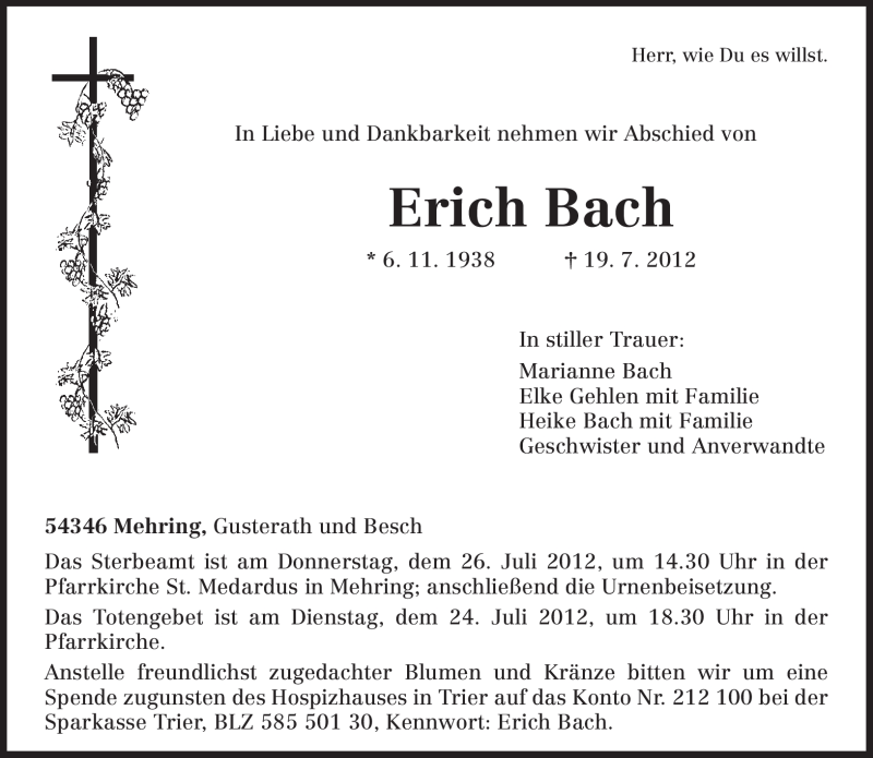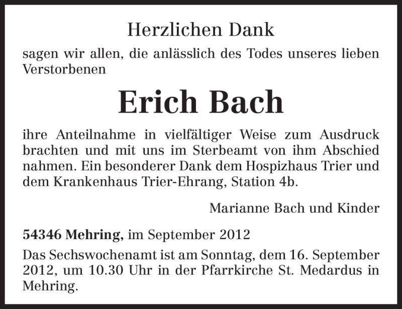 Hier finden Sie alle Traueranzeigen aus der Zeitung, die bisher für Erich Bach erschienen sind. Weitere Traueranzeigen, die in der Zeitung erscheinen, werden hier ebenfalls aufgelistet