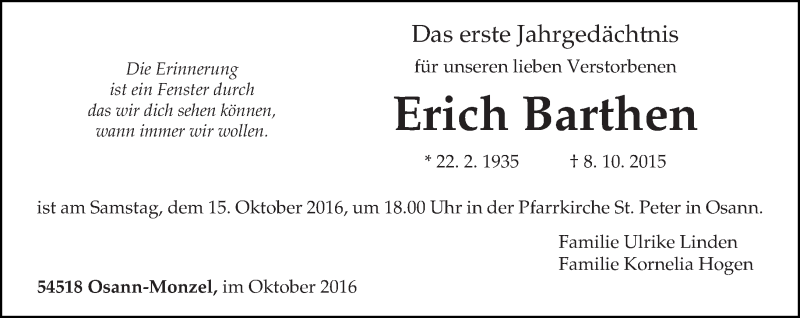 Hier finden Sie alle Traueranzeigen aus der Zeitung, die bisher für Erich Barthen erschienen sind. Weitere Traueranzeigen, die in der Zeitung erscheinen, werden hier ebenfalls aufgelistet