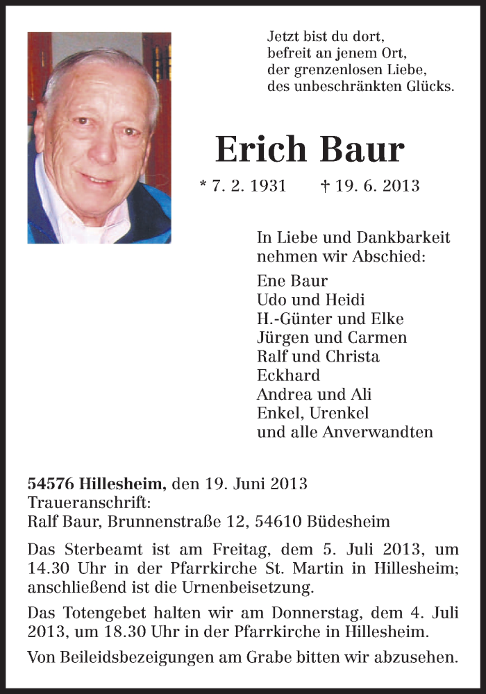 Hier finden Sie alle Traueranzeigen aus der Zeitung, die bisher für Erich Baur erschienen sind. Weitere Traueranzeigen, die in der Zeitung erscheinen, werden hier ebenfalls aufgelistet