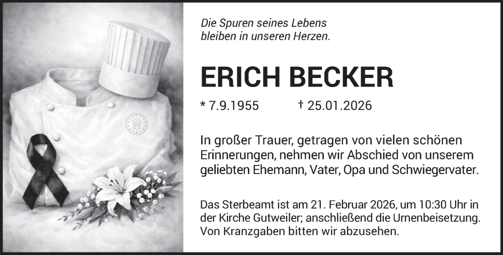 Hier finden Sie alle Traueranzeigen aus der Zeitung, die bisher für Erich Becker erschienen sind. Weitere Traueranzeigen, die in der Zeitung erscheinen, werden hier ebenfalls aufgelistet