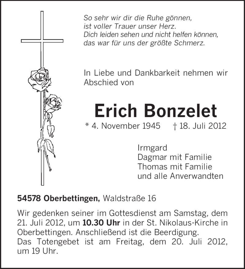 Hier finden Sie alle Traueranzeigen aus der Zeitung, die bisher für Erich Bonzelet erschienen sind. Weitere Traueranzeigen, die in der Zeitung erscheinen, werden hier ebenfalls aufgelistet