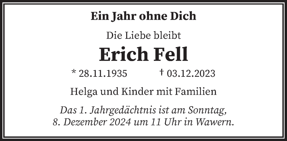 Hier finden Sie alle Traueranzeigen aus der Zeitung, die bisher für Erich Fell erschienen sind. Weitere Traueranzeigen, die in der Zeitung erscheinen, werden hier ebenfalls aufgelistet