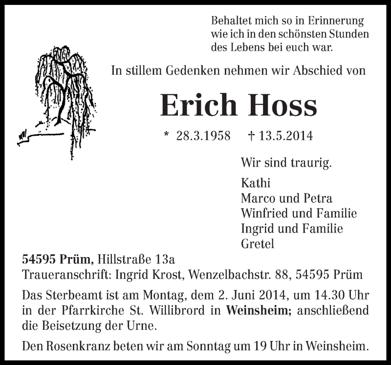 Hier finden Sie alle Traueranzeigen aus der Zeitung, die bisher für Erich Hoss erschienen sind. Weitere Traueranzeigen, die in der Zeitung erscheinen, werden hier ebenfalls aufgelistet