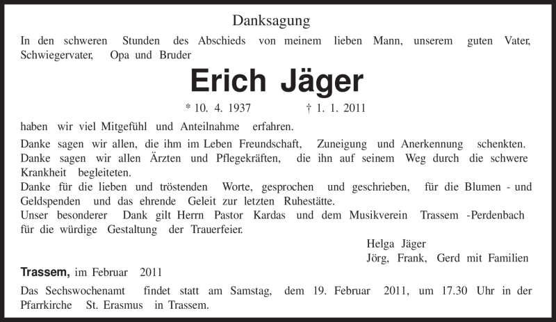 Hier finden Sie alle Traueranzeigen aus der Zeitung, die bisher für Erich Jäger erschienen sind. Weitere Traueranzeigen, die in der Zeitung erscheinen, werden hier ebenfalls aufgelistet