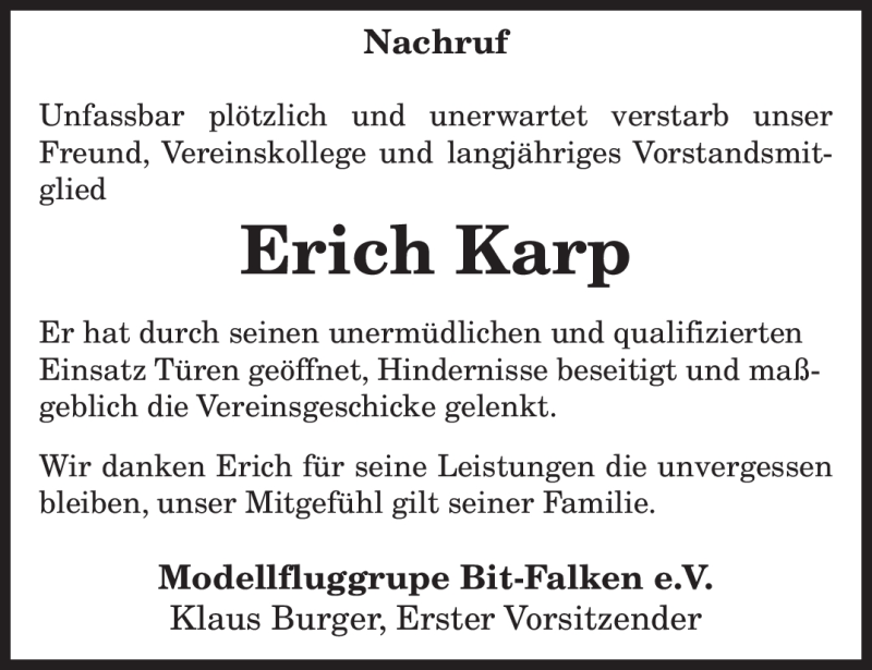 Hier finden Sie alle Traueranzeigen aus der Zeitung, die bisher für Erich Karp erschienen sind. Weitere Traueranzeigen, die in der Zeitung erscheinen, werden hier ebenfalls aufgelistet