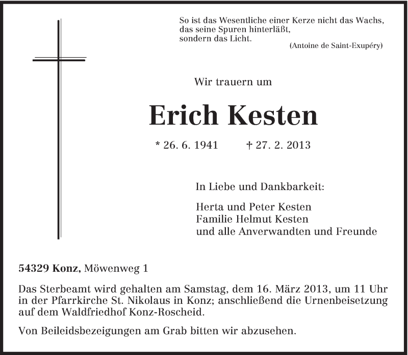 Hier finden Sie alle Traueranzeigen aus der Zeitung, die bisher für Erich Kesten erschienen sind. Weitere Traueranzeigen, die in der Zeitung erscheinen, werden hier ebenfalls aufgelistet