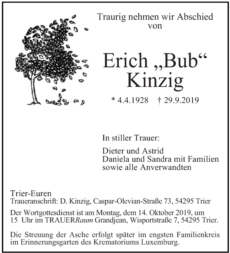 Hier finden Sie alle Traueranzeigen aus der Zeitung, die bisher für Erich Kinzig erschienen sind. Weitere Traueranzeigen, die in der Zeitung erscheinen, werden hier ebenfalls aufgelistet