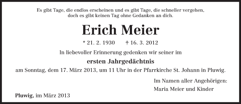 Hier finden Sie alle Traueranzeigen aus der Zeitung, die bisher für Erich Meier erschienen sind. Weitere Traueranzeigen, die in der Zeitung erscheinen, werden hier ebenfalls aufgelistet