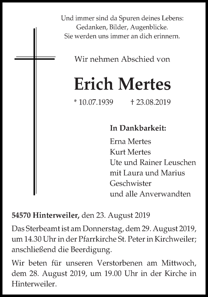 Hier finden Sie alle Traueranzeigen aus der Zeitung, die bisher für Erich Mertes erschienen sind. Weitere Traueranzeigen, die in der Zeitung erscheinen, werden hier ebenfalls aufgelistet
