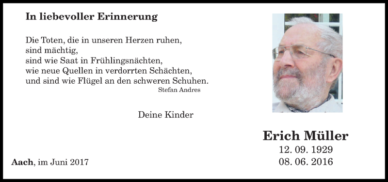 Hier finden Sie alle Traueranzeigen aus der Zeitung, die bisher für Erich Müller erschienen sind. Weitere Traueranzeigen, die in der Zeitung erscheinen, werden hier ebenfalls aufgelistet