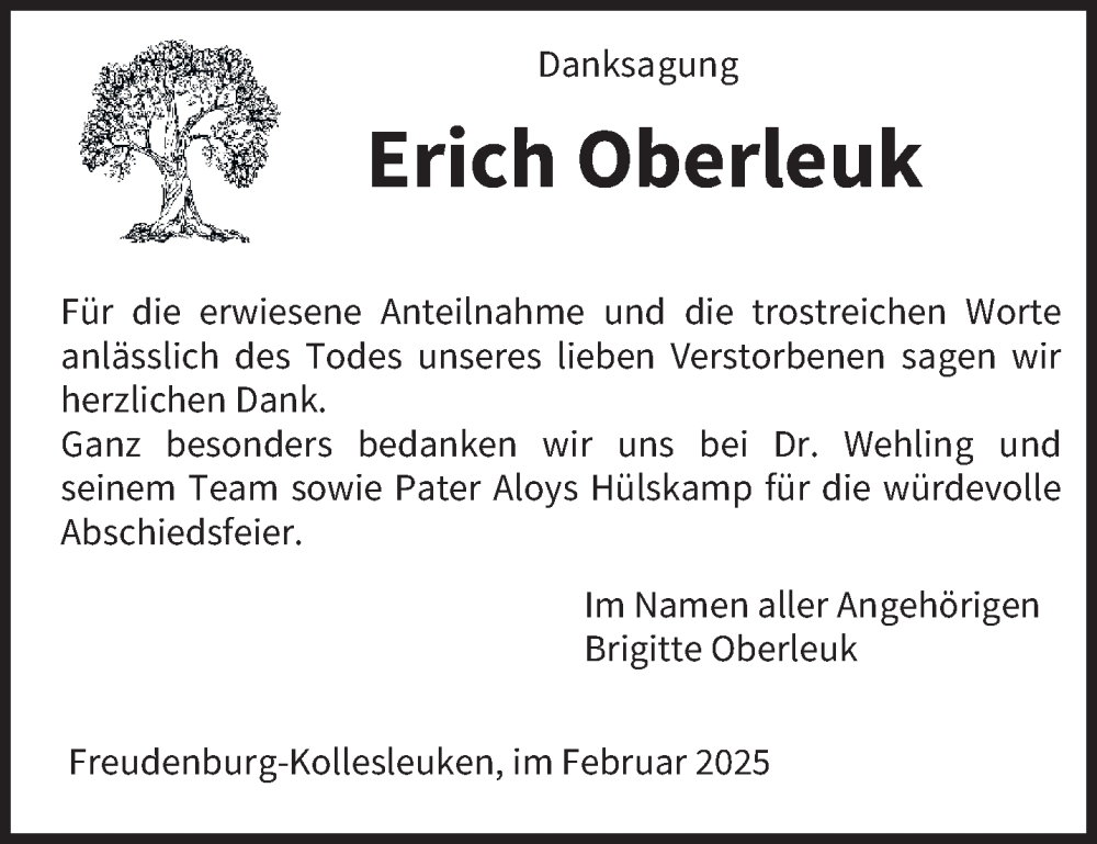 Hier finden Sie alle Traueranzeigen aus der Zeitung, die bisher für Erich Oberleuk erschienen sind. Weitere Traueranzeigen, die in der Zeitung erscheinen, werden hier ebenfalls aufgelistet