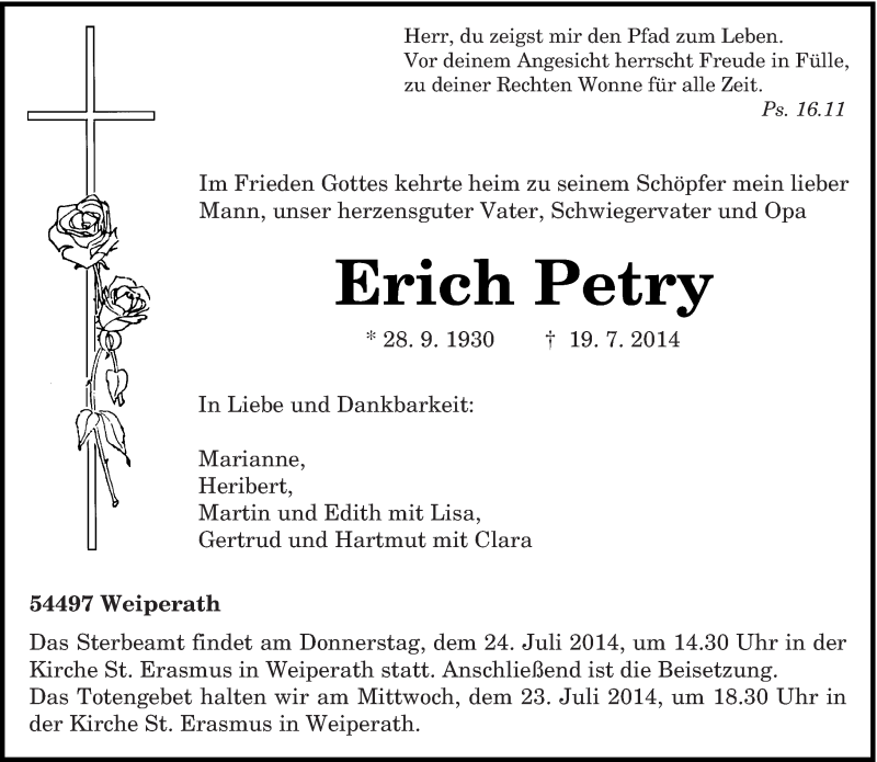 Hier finden Sie alle Traueranzeigen aus der Zeitung, die bisher für Erich Petry erschienen sind. Weitere Traueranzeigen, die in der Zeitung erscheinen, werden hier ebenfalls aufgelistet