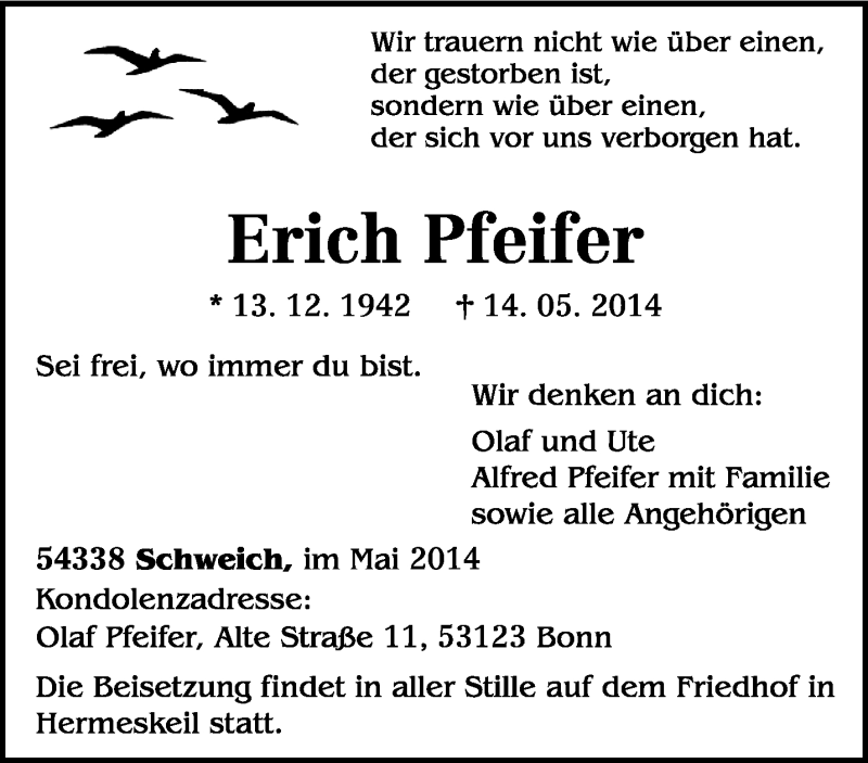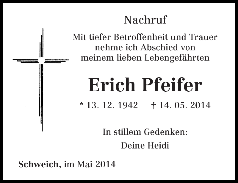 Hier finden Sie alle Traueranzeigen aus der Zeitung, die bisher für Erich Pfeifer erschienen sind. Weitere Traueranzeigen, die in der Zeitung erscheinen, werden hier ebenfalls aufgelistet