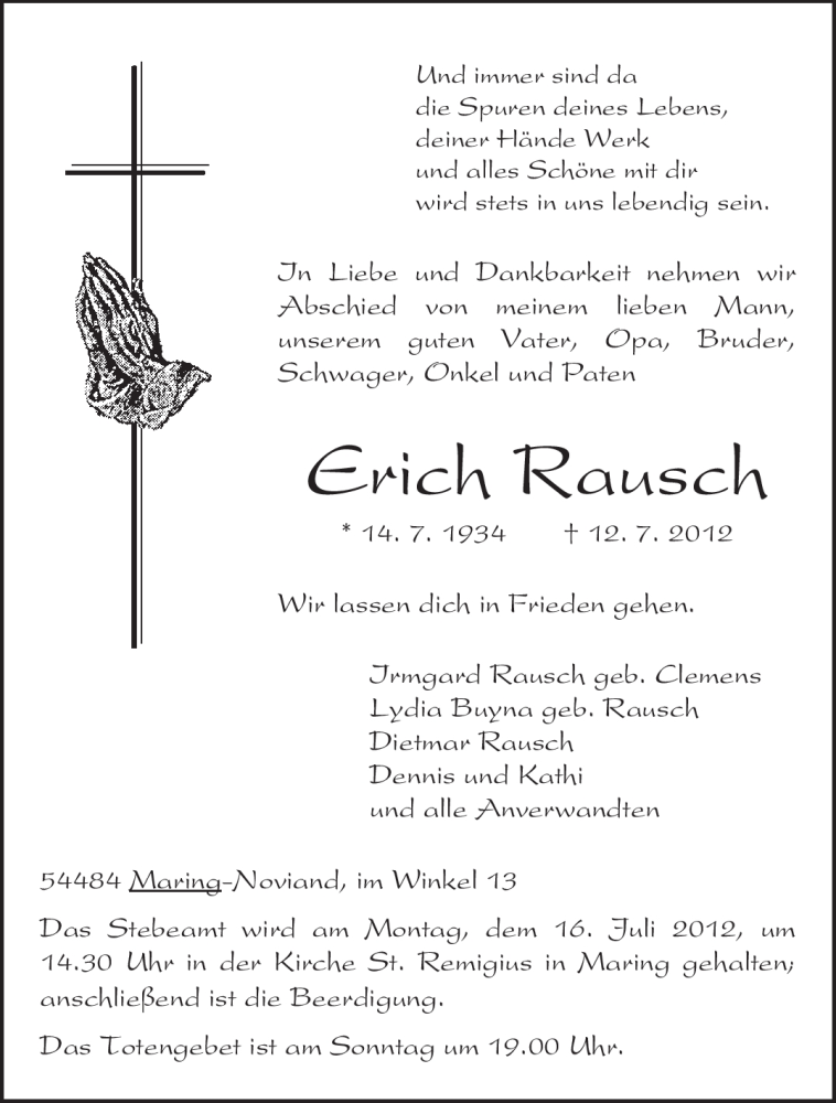 Hier finden Sie alle Traueranzeigen aus der Zeitung, die bisher für Erich Rausch erschienen sind. Weitere Traueranzeigen, die in der Zeitung erscheinen, werden hier ebenfalls aufgelistet